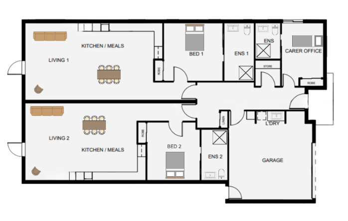 The house is a purpose-built Robust design that features two fully independent SDA units under one roof, offering residents the perfect balance of privacy, autonomy, with a 1:1 Support ratio and shared overnight support model