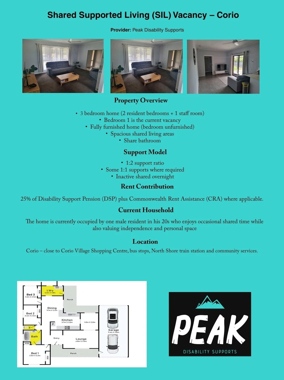 3 bedroom home (2 resident bedrooms + 1 staff room)